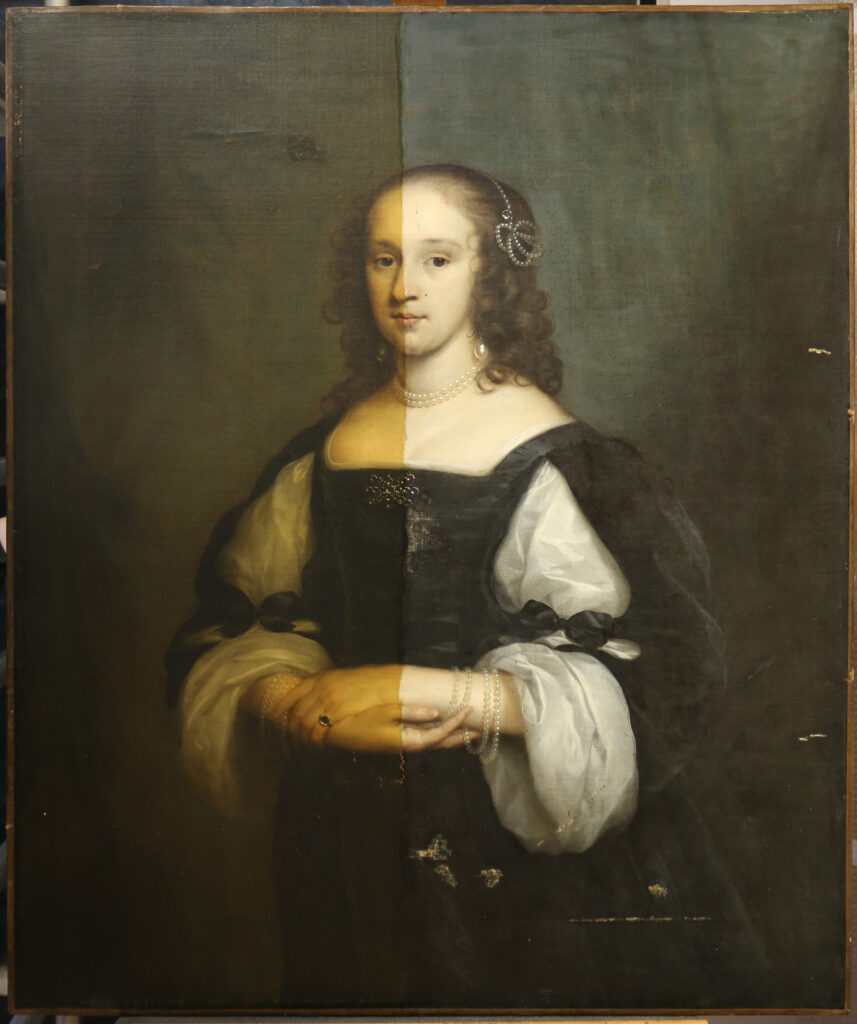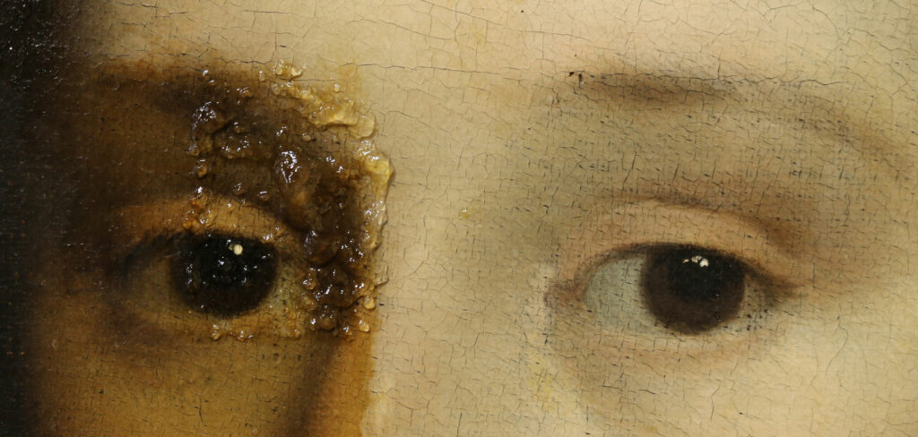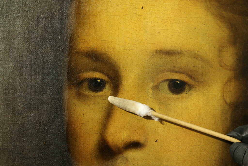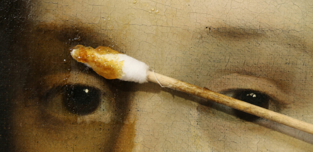 Aan de hand van uitgebreide reinigingstesten is het de vernislaag vervolgens verwijderd doormiddel van een met solvent geladen gel. Door een gel te gebruiken kon geconcentreerder worden gewerkt terwijl de contacttijd van het solvent met de verflaag wordt geminimaliseerd. De gel werd met een penseel aangebracht waarna het na een korte inwerktijd, met de vernis erin, met een droge wattenstaaf kan worden verwijderd.